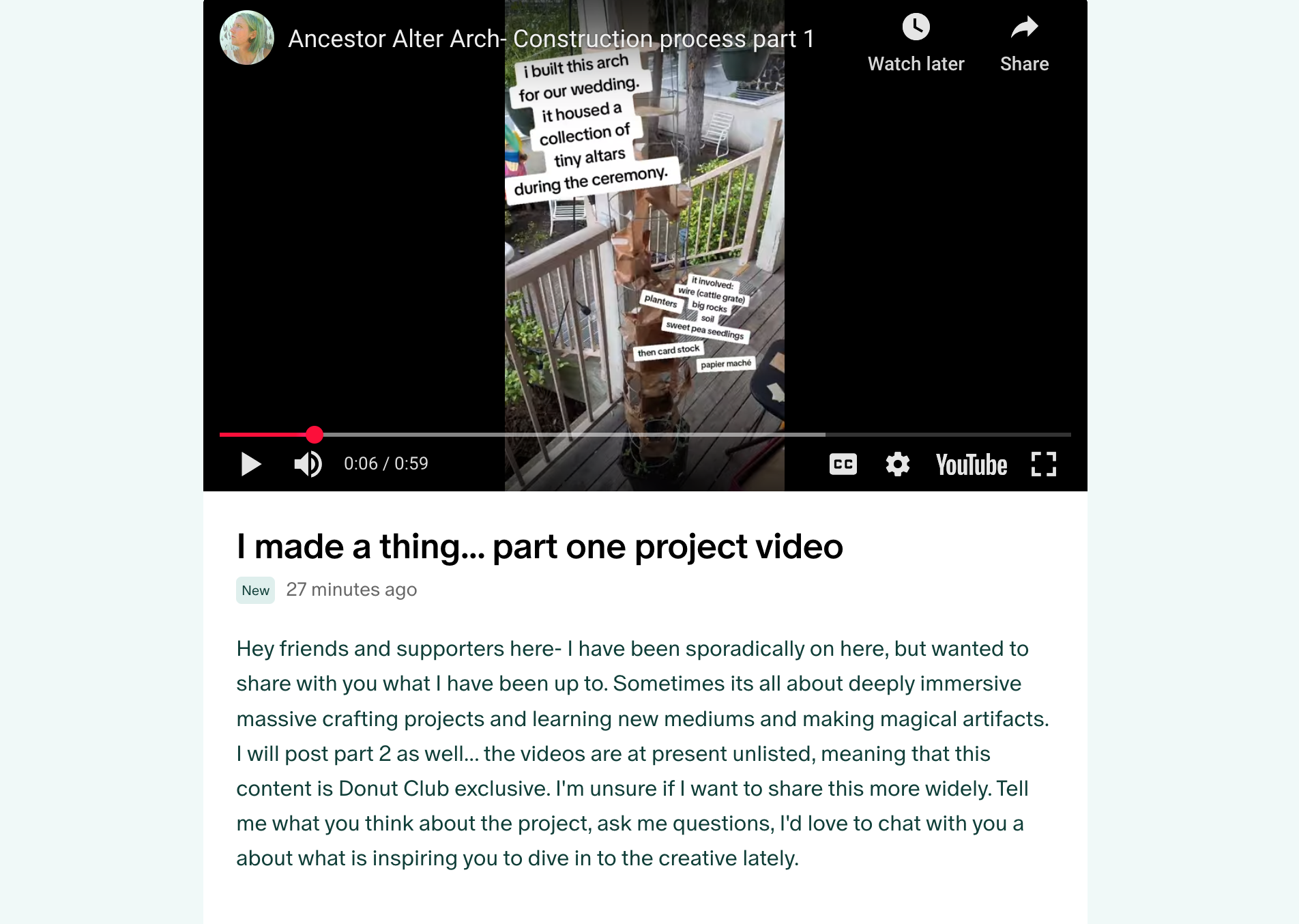 I made a couple of little videos about the massive art project I took on in preparation of our wedding last week. It was about 6 weeks of experimenting in a whole bunch of mediums that were new to me, learning as I went, creating a 3 piece arch way that could hold a whole bunch of tiny altars to our dead. The vibe it took on was that of “Dystopian Dive Bar” and I am really excited to share about it with folks who didn’t get a chance to see it in person. I may at some point share more about this project more broadly- but for now, these are just for the lovely and supportive folks that keep a little trickle of money coming my way to support the things that I get up to.